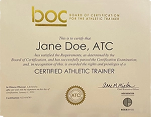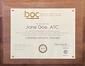 The BOC offers a beautifully designed certificate with gold embossed BOC logo and seal of certification. Each certificate is personalized with the BOC Certified Athletic Trainer’s name, ATC® credential, certification number and date of certification. Athletic Trainer must currently hold the ATC® credential in order for a certificate/plaque order to be processed.