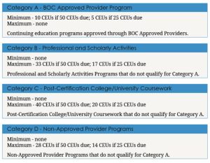 The “Certification Maintenance Requirements” document and BOC website are important resources that can provide more information on CE categories, the number of CEUs and the required documentation that will be needed if you are audited. The BOC CE Categories Tutorial videos and Individual Activity Review are also helpful resources available for ATs.