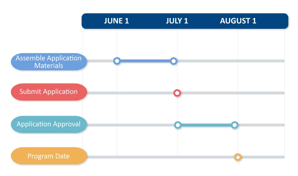 To ensure you meet timing requirements within the approval process, it’s recommended to develop your timeline working backwards. Set your deadline based on the planned future program date.