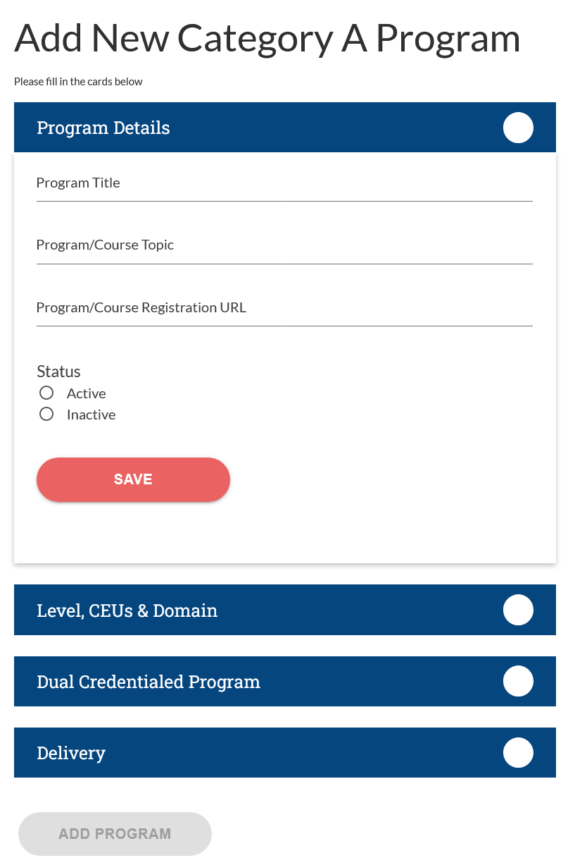 Under “Program Details” make sure to add the appropriate “Program Title” to your listing should match what is listed on the AP certificate of completion. APs will also add topic, registration link (website links preferred) and mark status as Active. Next, the AP should add difficulty level, CEUs, domain(s), dual credential program (if applicable) and delivery. Make sure to select “Save” after completing each section. Complete the listing by selecting “Add Program” at the bottom.