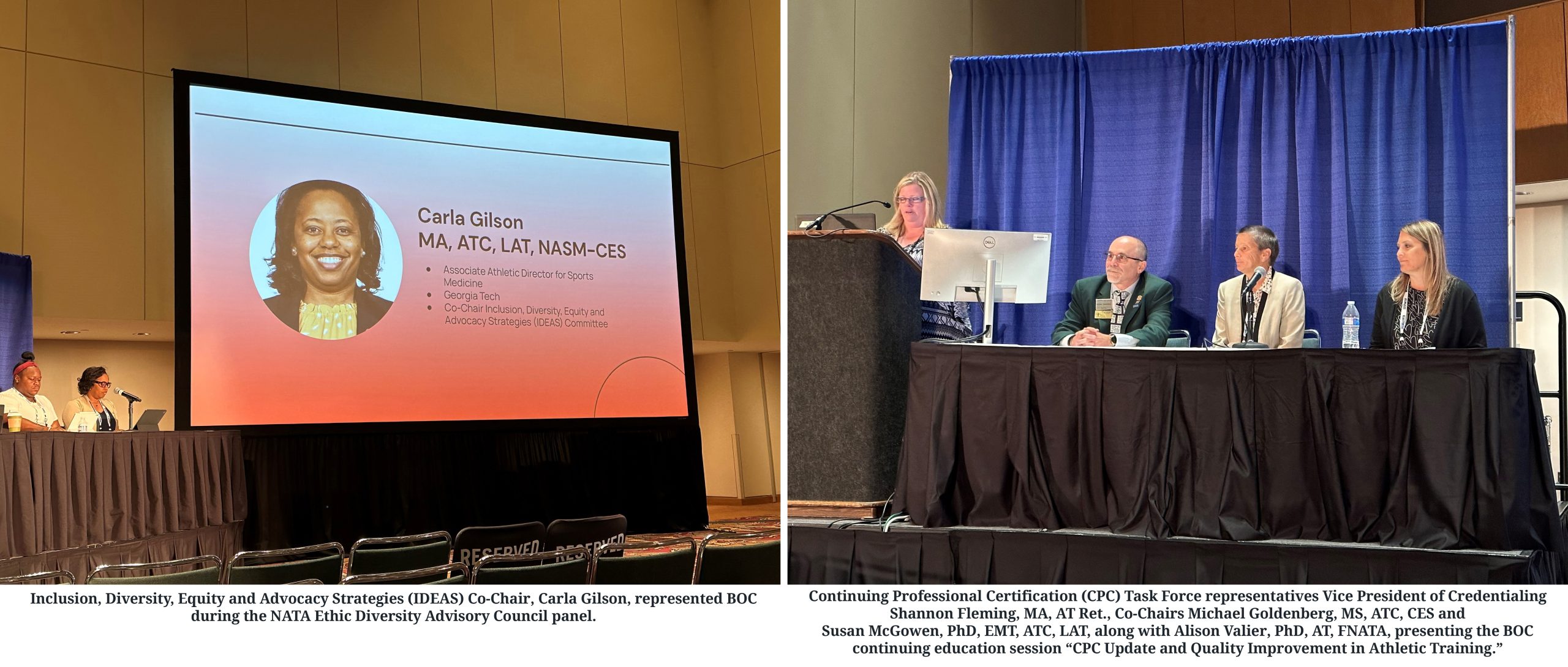 During the NATA event, several BOC volunteers participated in special events and/or were honored.Inclusion, Diversity, Equity and Advocacy Strategies (IDEAS) Co-Chair, Carla Gilson, represented BOC during the NATA Ethic Diversity Advisory Council panel. In addition, Continuing Professional Certification (CPC) Task Force representatives Co-Chairs Michael Goldenberg, MS, ATC, CES and Susan McGowen, PhD, EMT, ATC, LAT, along with Alison Valier, PhD, AT, FNATA, presented the BOC continuing education session “CPC Update and Quality Improvement in Athletic Training.”