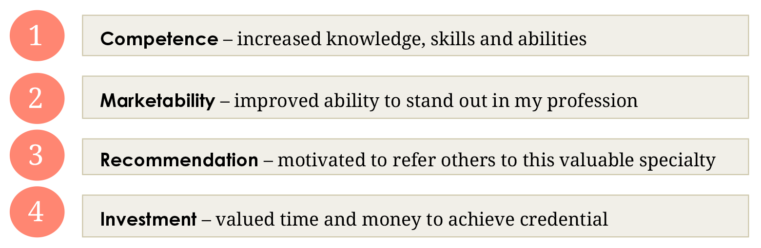 Part of the survey included a measurement of ranked attributes that respondents felt were tied to achieving the credential. Top attributes included the following.