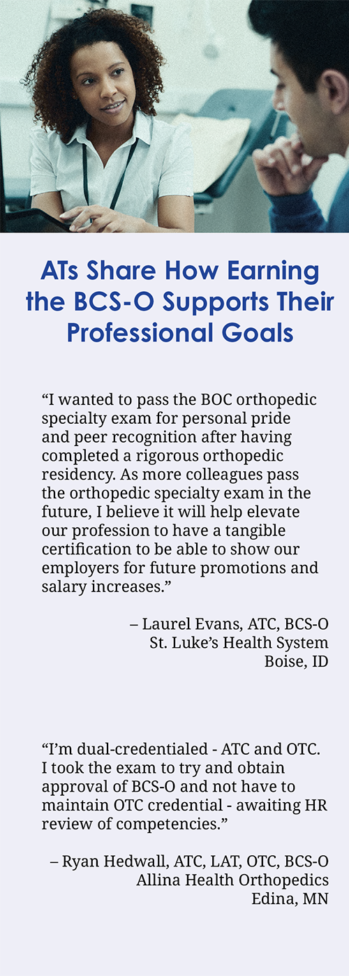 The BOC conducted an initial survey of the first cohort (included BCS-O credential holders from October 2021 and February 2022 exams) which resulted in some interesting results. The survey’s objective was to capture what motivated ATs to take the orthopedic specialty exam and what they hope to gain through earning the orthopedic specialty, as well as other insights. This initial feedback showed a variety of benefits including role enhancement, increased value and in some cases immediate increased salary. Data gathered will serve as baseline statistics for future comparison. In addition, responses will help the BOC capture a view of the tangible impact earning the BCS-O credential brings over time.