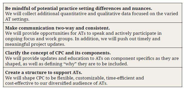 Once results from this phase are analyzed, outcomes will be reviewed by the CPC Task Force which will then make recommendations for next steps. This progression will continue over the next two to three years until CPC is finalized and implemented to meet the needs of ATs while fulfilling the level of certification required to enhance our profession and protect the public.