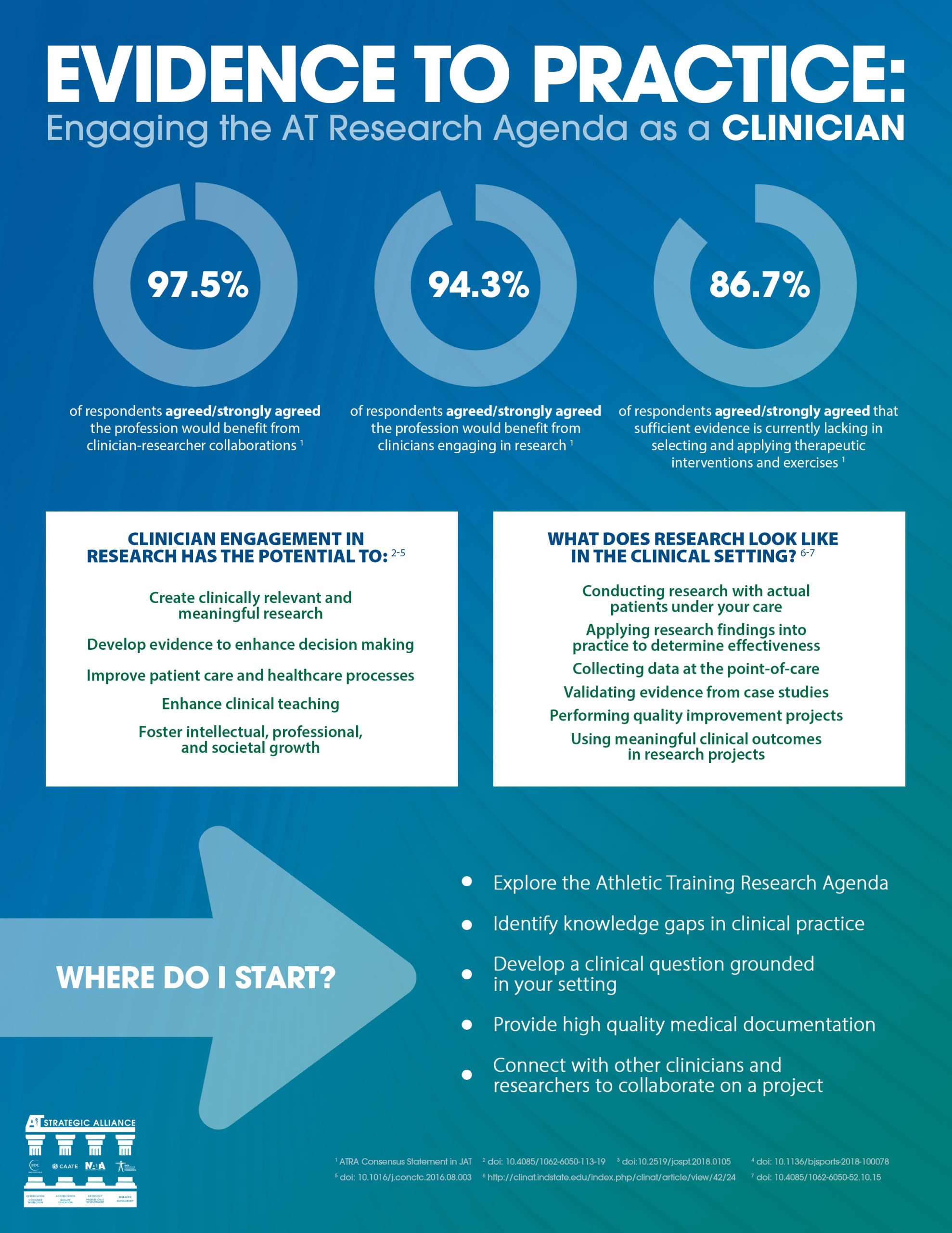 The Strategic Alliance Research Agenda Task Force conducted a mixed methodology study consisting of six focus-groups, a content-expert review and a web-based survey. The below infographic takes a closer on how a clinician can utilize the athletic training research agenda in their practice.